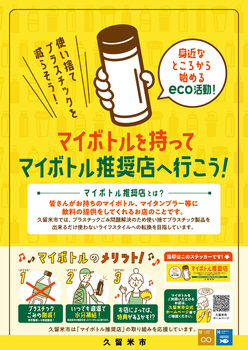 プラスチックは、私たちの暮らしの中でさまざまなものに使われています。使用済のプラスチックごみの一部がポイ捨てなどで海まで流れています。その量は世界で年間800万トンです。この状況が続けば、2050年には海中のプラスチック量が魚の量を超えると言われています。これらは食物を通じて、私たちの体内にも蓄積され、健康被害を及ぼす恐れもあります。そのため、久留米市では、使い捨てプラスチック製品を出来るだけ使わないライフスタイルへの転換を目指すため、『マイボトル推奨店』を応援しています。