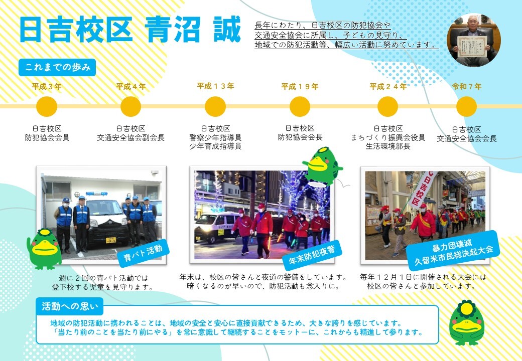 長年にわたり、日吉校区の防犯協会や交通安全協会に所属し、子どもの見守り、地域での防犯活動等、幅広い活動に努めています。 |