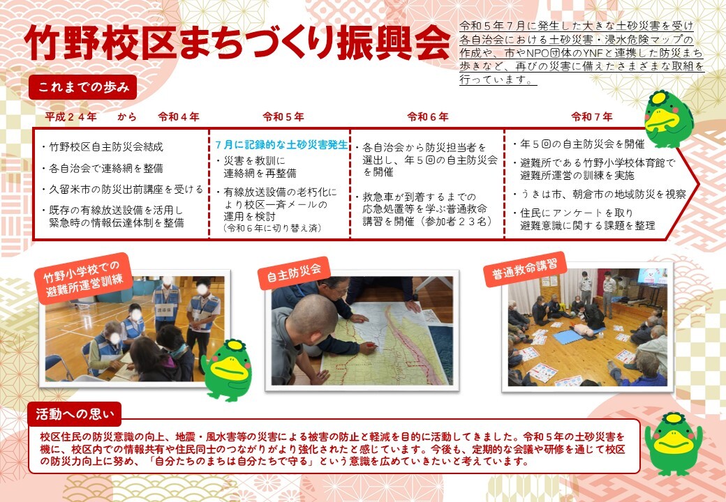 令和5年7月に発生した大きな土砂災害を受け、各自治会における土砂災害・浸水危険マップの作成や、市やNPO団体のYNFと連携した防災まち歩きなど、再びの災害に備えたさまざまな取組を行っています。 |