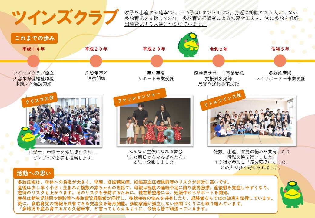 双子を出産する確率1%、三つ子は0.01%~0.02%。身近に相談できる人がいない多胎育児を支援して23年。多胎育児経験者による知恵や工夫を、次に多胎を妊娠出産育児する人達につなげています。 |