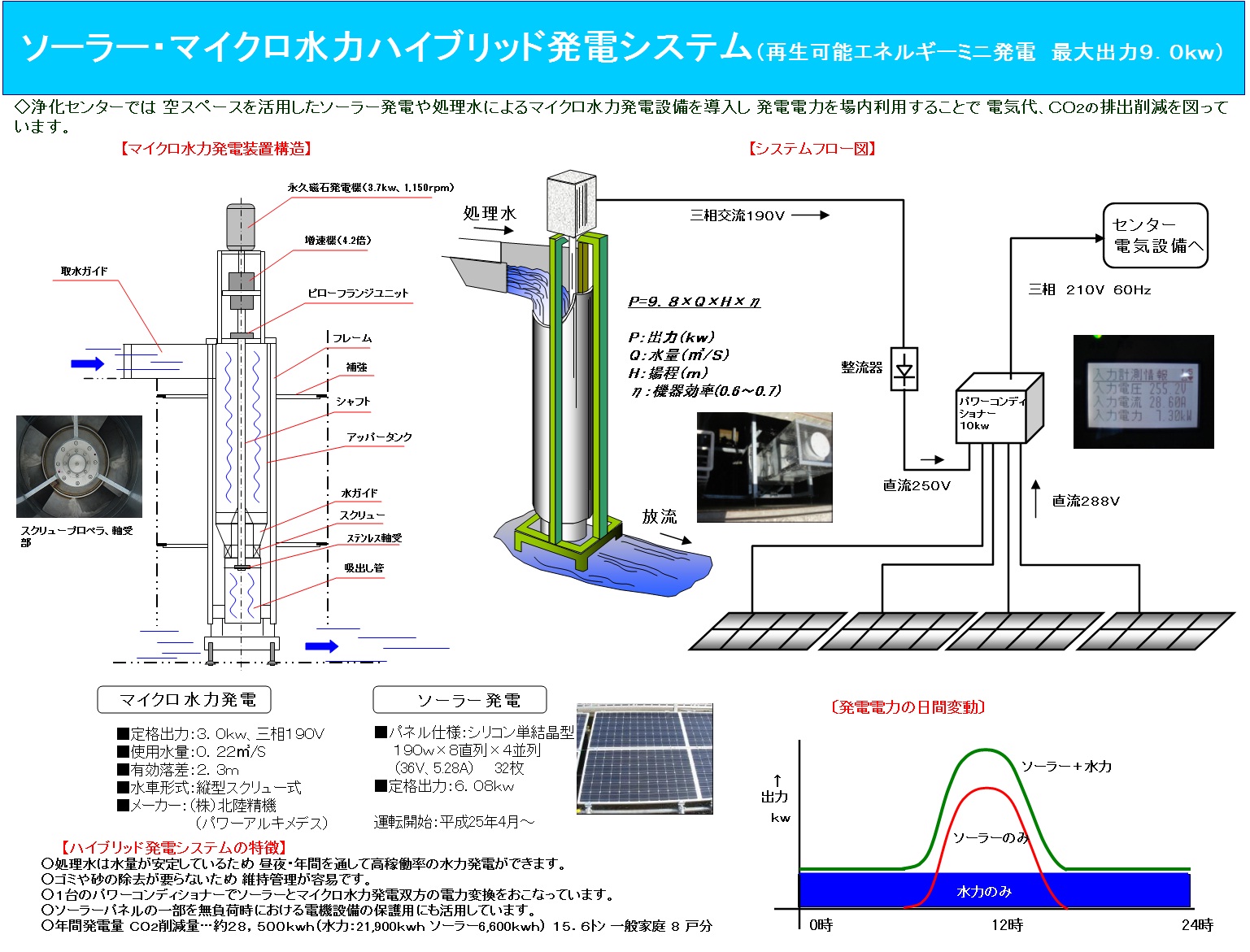 左が「ソーラー発電施設」、右が「マイクロ水力発電施設」(ソーラー・マイクロ水力発電システムフロー図JPEG形式 (451キロバイト))