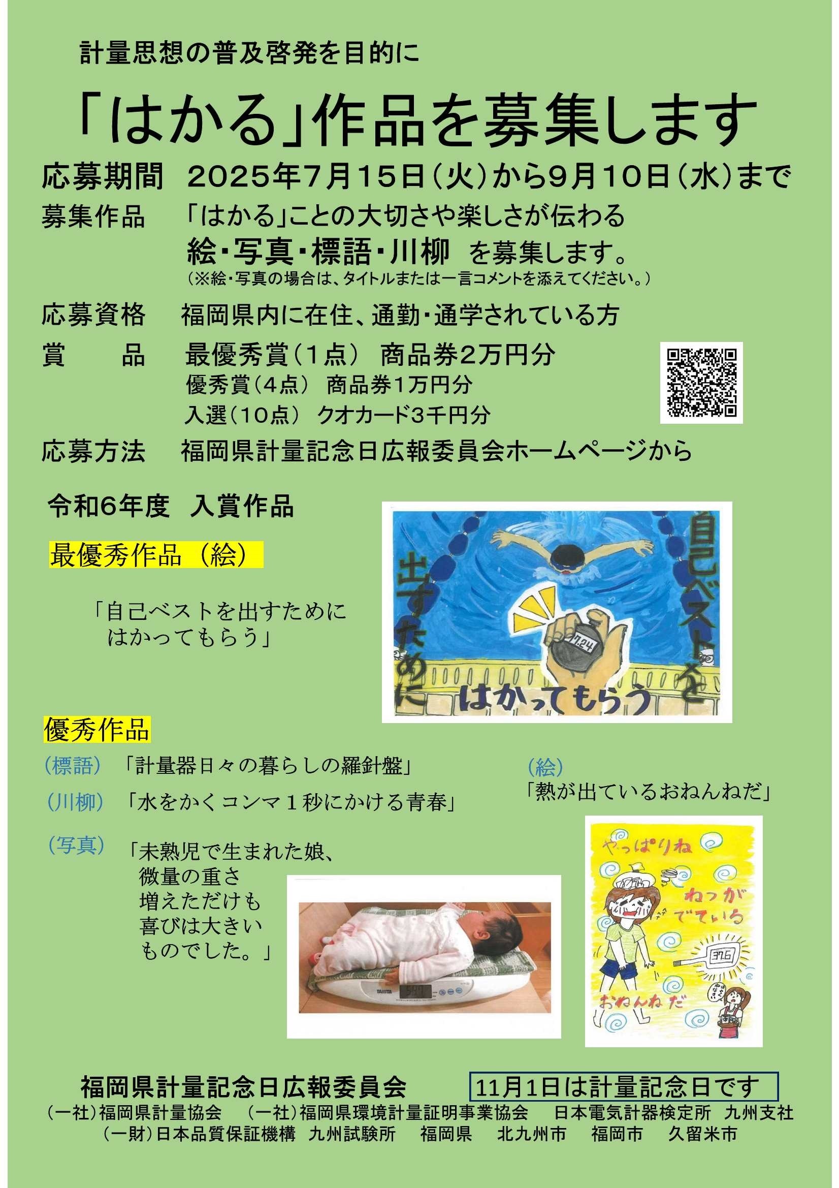 「はかる」ことの大切さ、おもしろさが伝わる絵・写真・標語・川柳の作品を募集します。福岡県内に在住、通勤・通学されている方限定で、優秀作品には賞品を贈呈します。