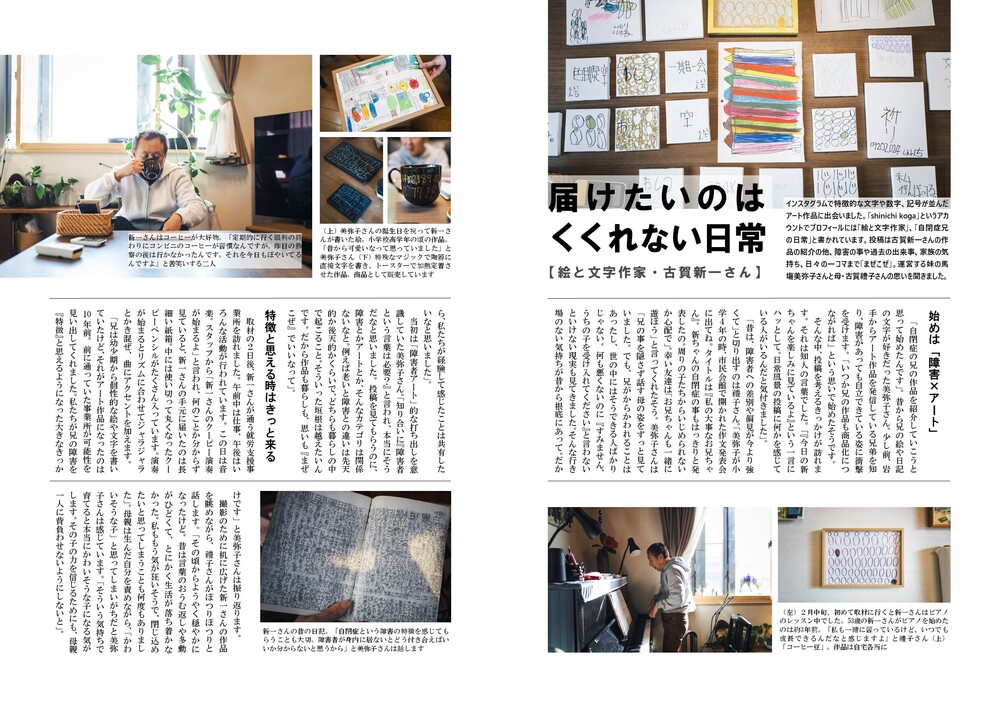 「新ちゃんとは本当にいろんな苦労を乗り越えてきました」と禮子さん。「1~2歳のころから新聞の経済欄を眺め、国旗なんか一度見たら覚える。我が家に天才が生まれたと思いました。その矢先、3歳で自閉症と判明。続けざまに腎盂炎になって死の間際までいきました。中学ではひどいいじめに遭い、30代で入所した施設では治療で薬漬けに。生死をさまよいました」。いろんな出来事やその時々の感情を家族で乗り越え、ようやく新一さんとアートが出会います。「こんなに楽しい活動につながった。今不安な人に今の兄を見てもらって、未来はつらいことばかりじゃないと感じてほしい。だからこそ私たちが向き合った現実も届けないと。楽ではなかったけど、乗り越えてみると意外と大丈夫なだったり、良いこともあったりして。言語化は難しいけど、そんな雰囲気を、兄と私たちの日常から感じてもらえると嬉しく思います」。