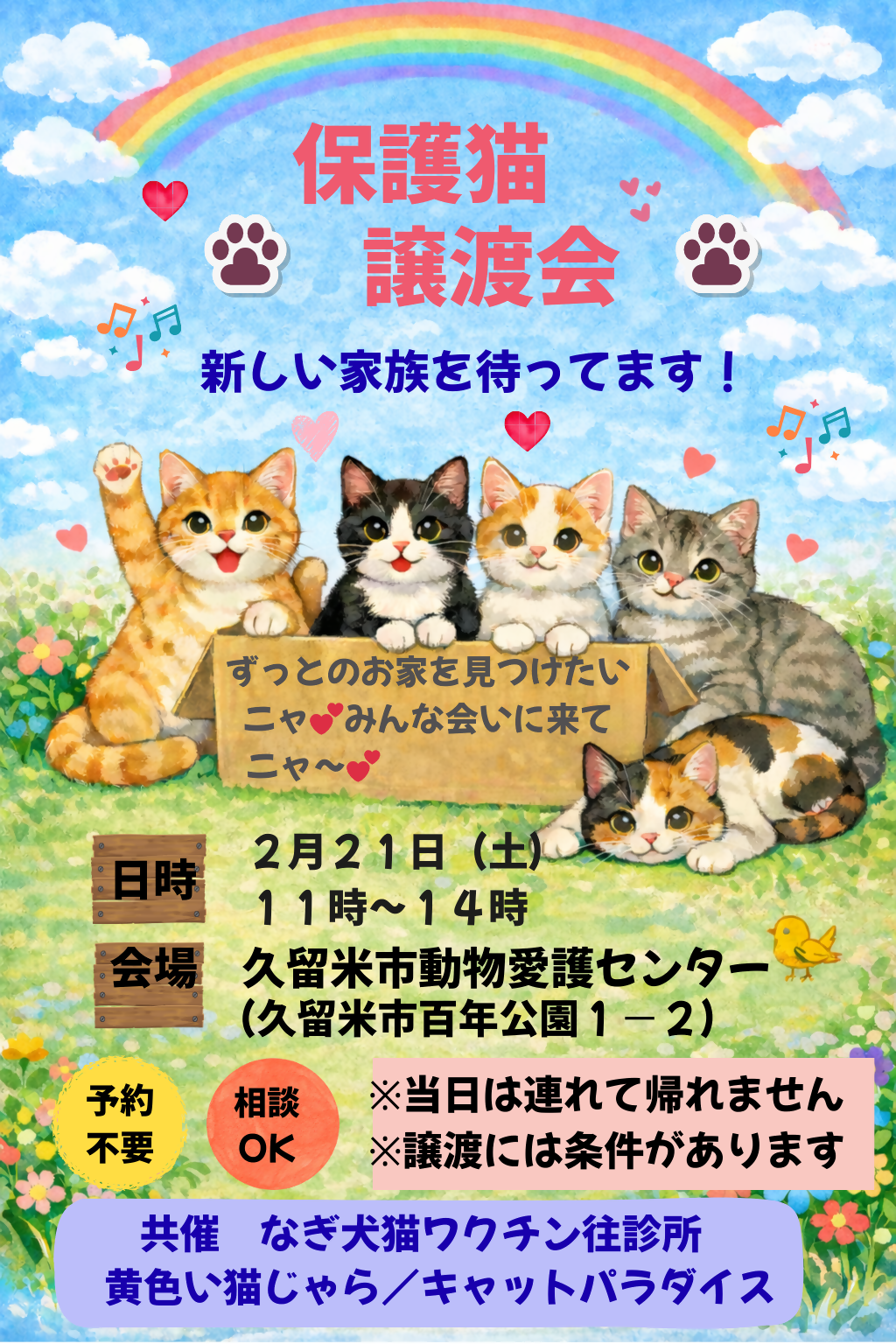 久留米市動物愛護センターを会場に、動物愛護団体による譲渡会が開催されます。譲渡会の参加は無料で、事前申込みは不要です。