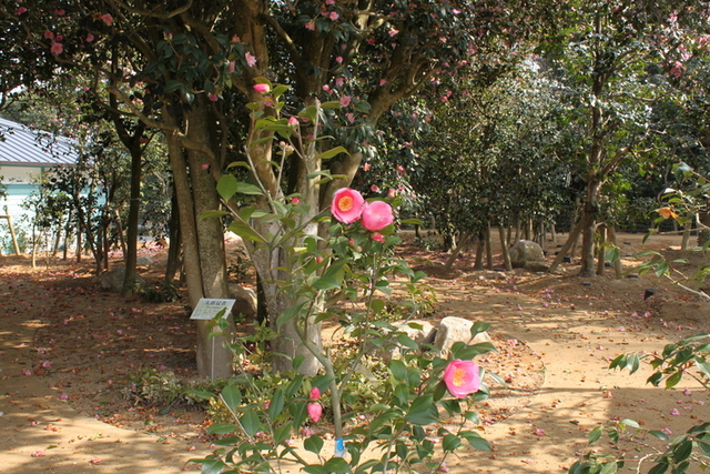 銘木といわれる樹齢80年以上の「太郎(たろう)冠者(かじゃ)」「絞(しぼり)蝋(ろう)月(げつ)」をはじめ、約50種類のツバキを植栽し、歩道を散策しながら鑑賞できます。